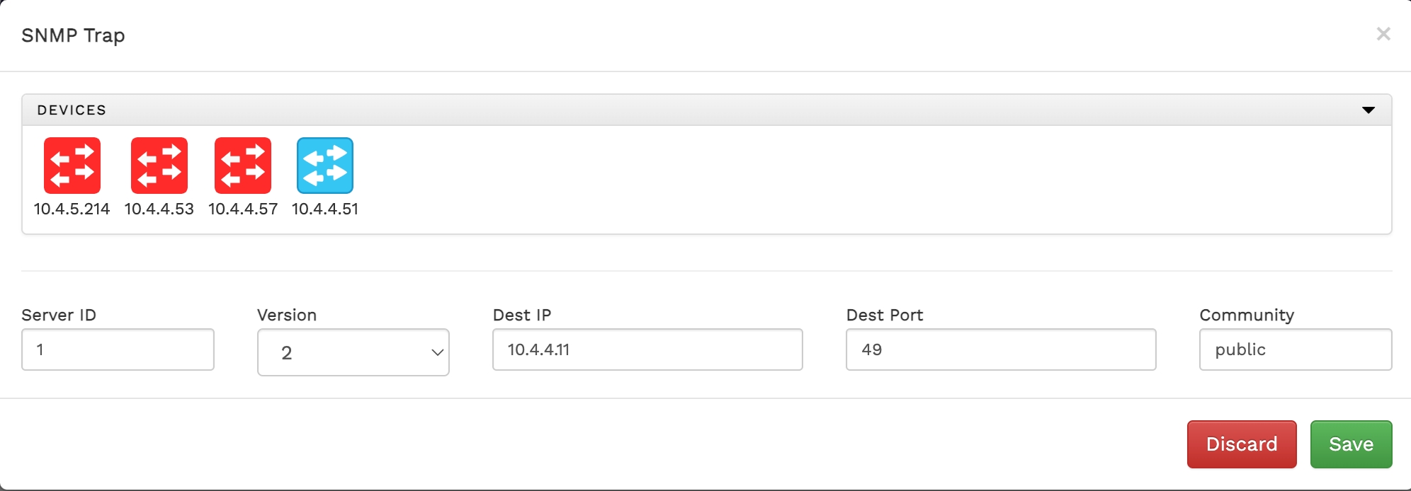The following image shows the SNMP Trap page with the switches and configured SNMP Traps: