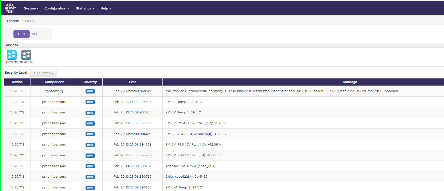 The Syslog page shows the system logs of all the devices that are online. You can click the device icon for each of the online devices to get the system log for that particular device. The system log shows the device IP, component, severity level, time stamp, and the severity level message with more specific information.