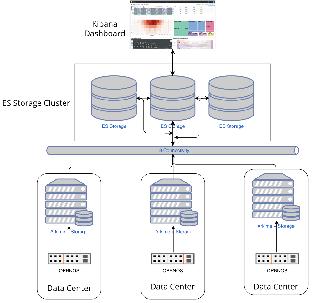 For centralized storage Elastic Storage cluster is utilized which supports distributed scalable storage along with automatic sharding. The metadata saved across the elastic cluster is visualized using Kibana which provides drilled-down information about sessions, network stats and dashboards