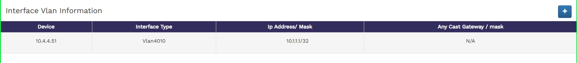 A table with VLAN details, including Device IP, Interface Type, Ip Address/ Mask ,Any Cast Gateway / mask and options to Delete VLANs.