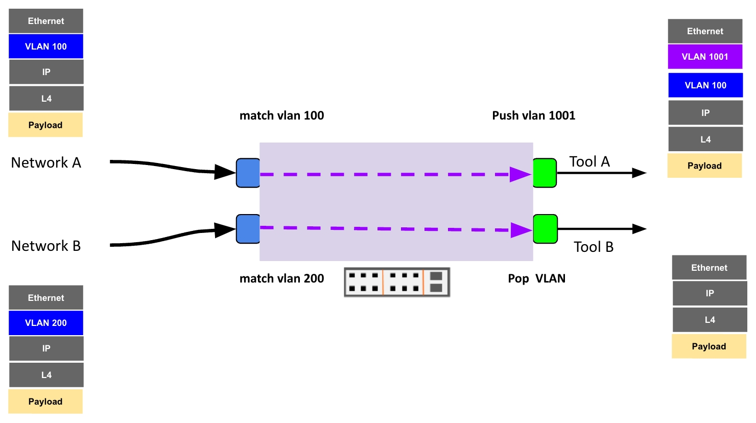 VLAN aware mode provides APB administrators with the ability to match and modify packets in the flow before forwarding them to the tool port(s).