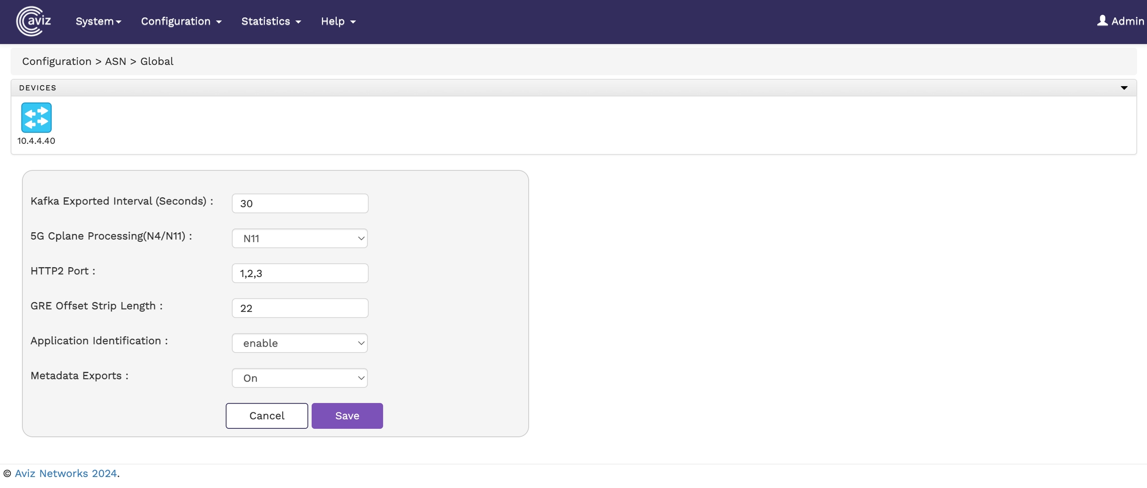 To view and configure ASN global parameters from the FlowVision GUI, navigate to: