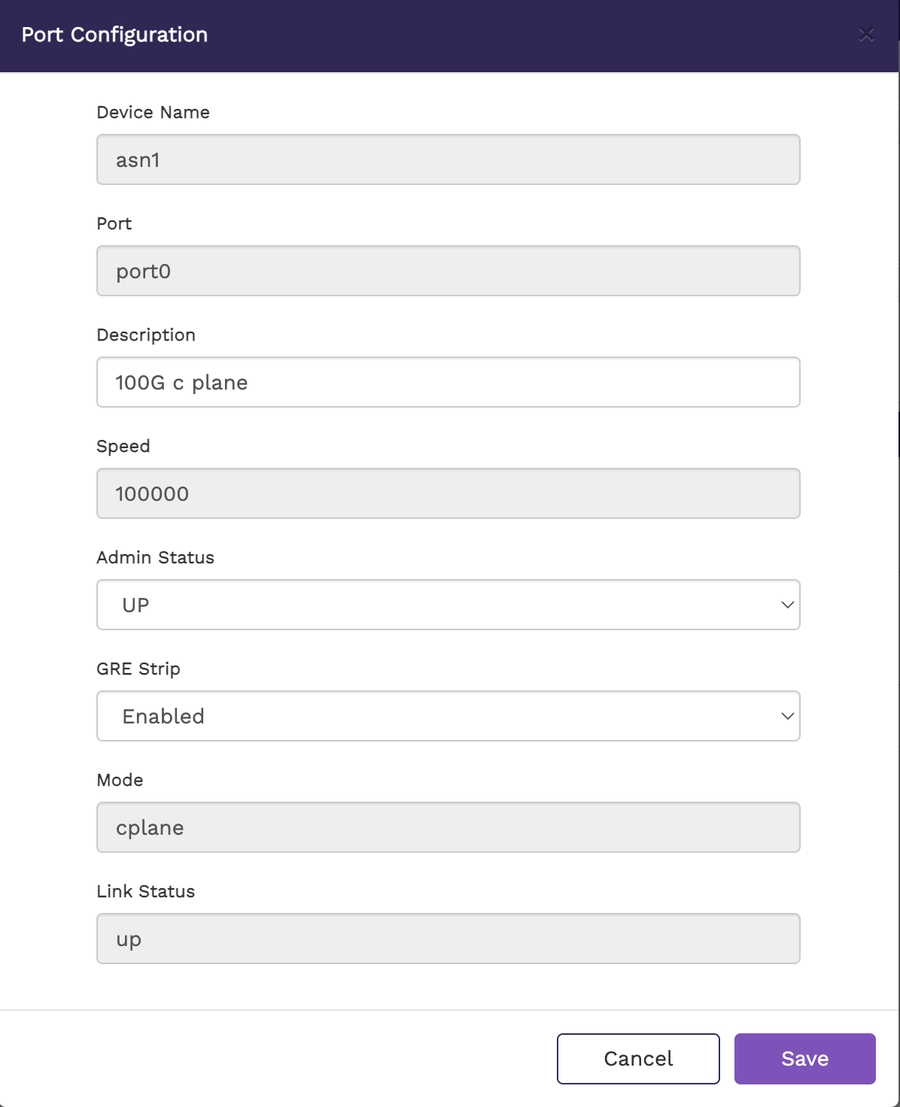 - GRE Strip: Enables or disables GRE stripping on incoming packets (applicable only to C-plane ports).