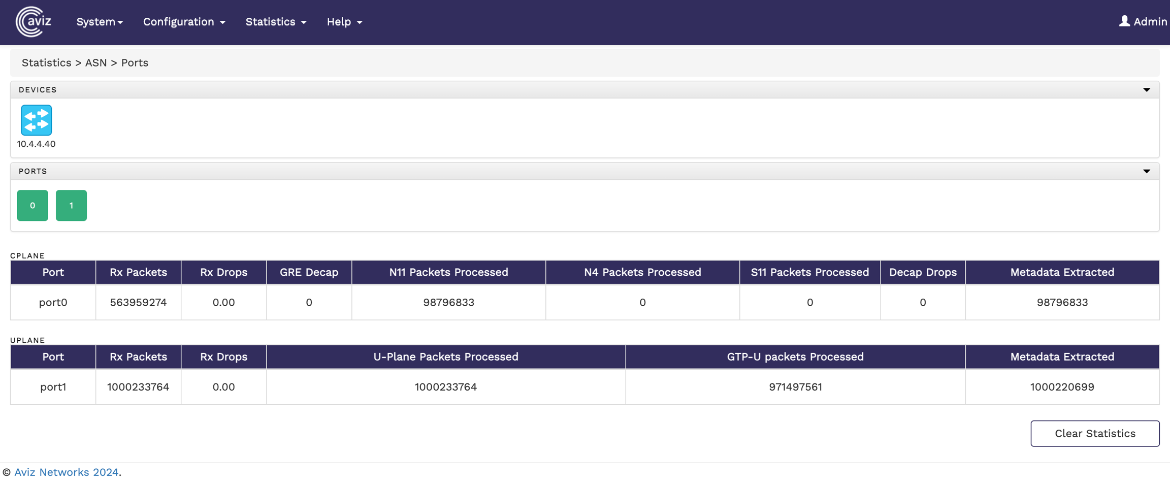 The following image shows the ASN port statistics page: