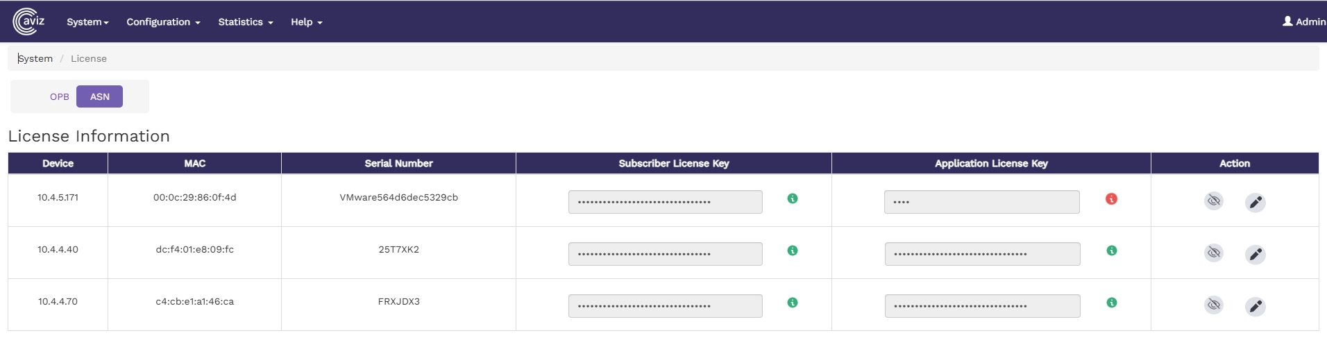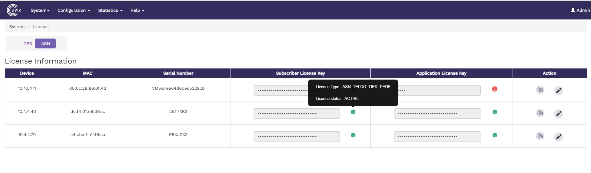 - The following license details are shown for each ASN device: - Subscriber License Key, Type & Status