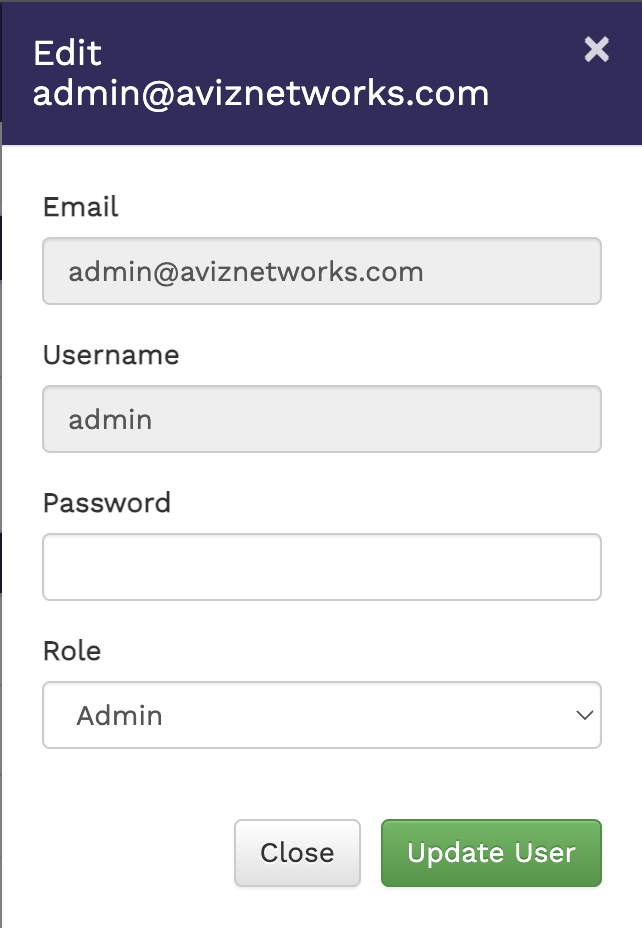 Specify the Email address, Username, Password, and Role of the new user in their respective fields. The Role drop-down field has two options - Admin and Viewer. The Admin role has full access and the Viewer role has read-only access.
