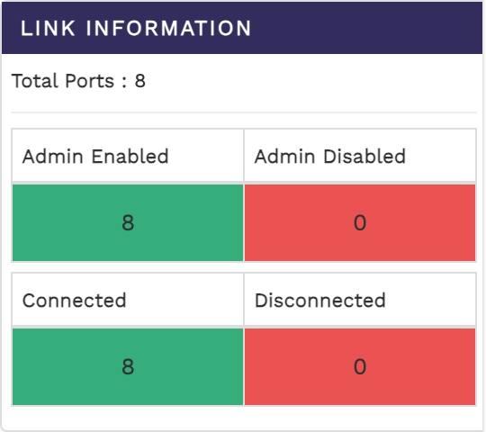 The link information table displays the total number of ports across all connected nodes, the number of ports enabled with administrative privileges, and the number of ports that are down.