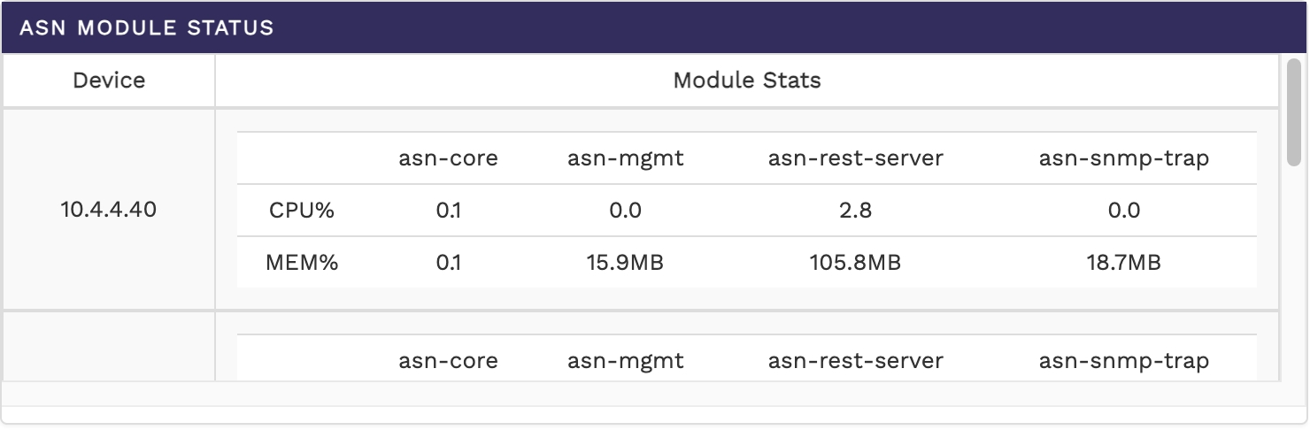 The ASN Module Status shows the top nodes and their health with details about the various components of ASN sorted node IP.