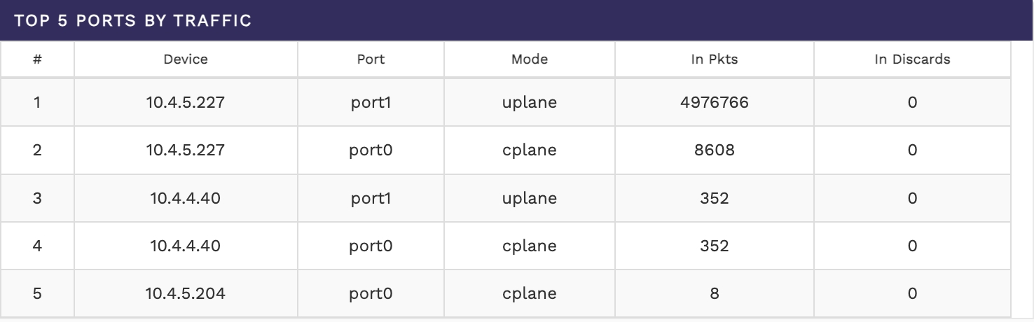 The top 5 ports by traffic show you the top 5 ports across all connected nodes sorted on the basis of their traffic rate. The table shows you the device, port, Mode, In Pkts & the number of In Discards.