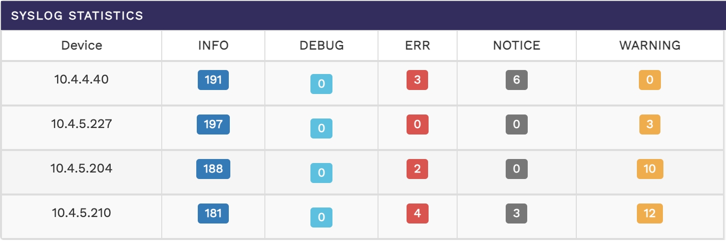 The SYSLOG Statistics shows you the nodes sorted based on the SYSLOG messages. The table shows the device IP, and the number of SYSLOG messages, filtered by severity.