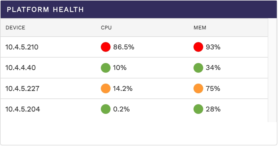 The platform health table shows you the CPU usage, and memory availability for each connected node. From this data, you can infer the overall health of the platform.