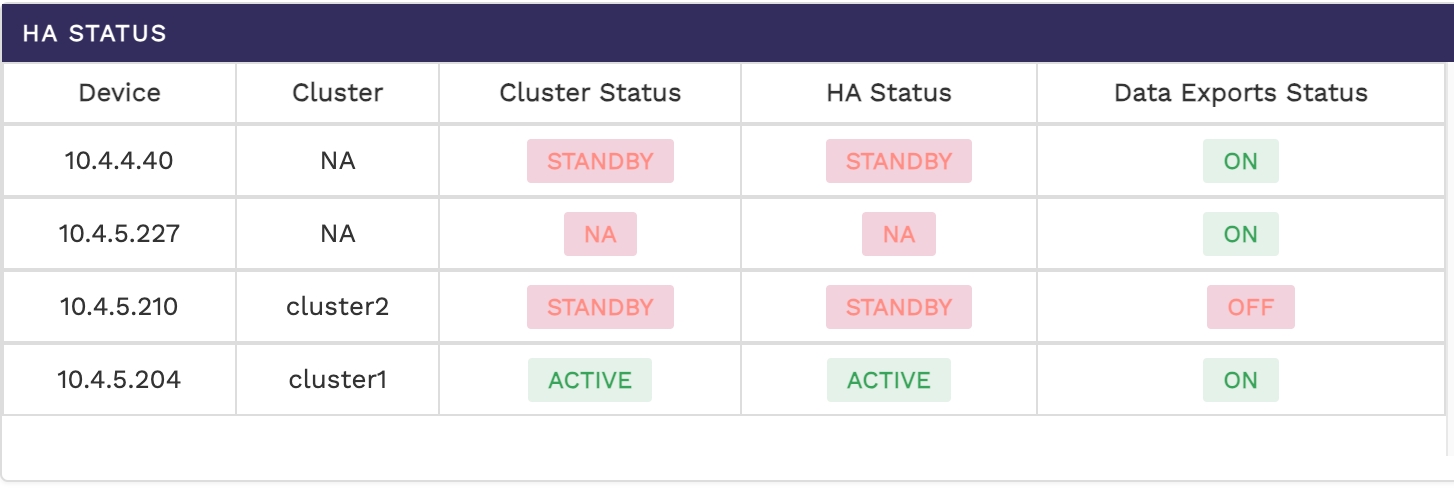 The HA Status shows the HA status between the connected nodes along with the Cluster Status & Data Export Status.