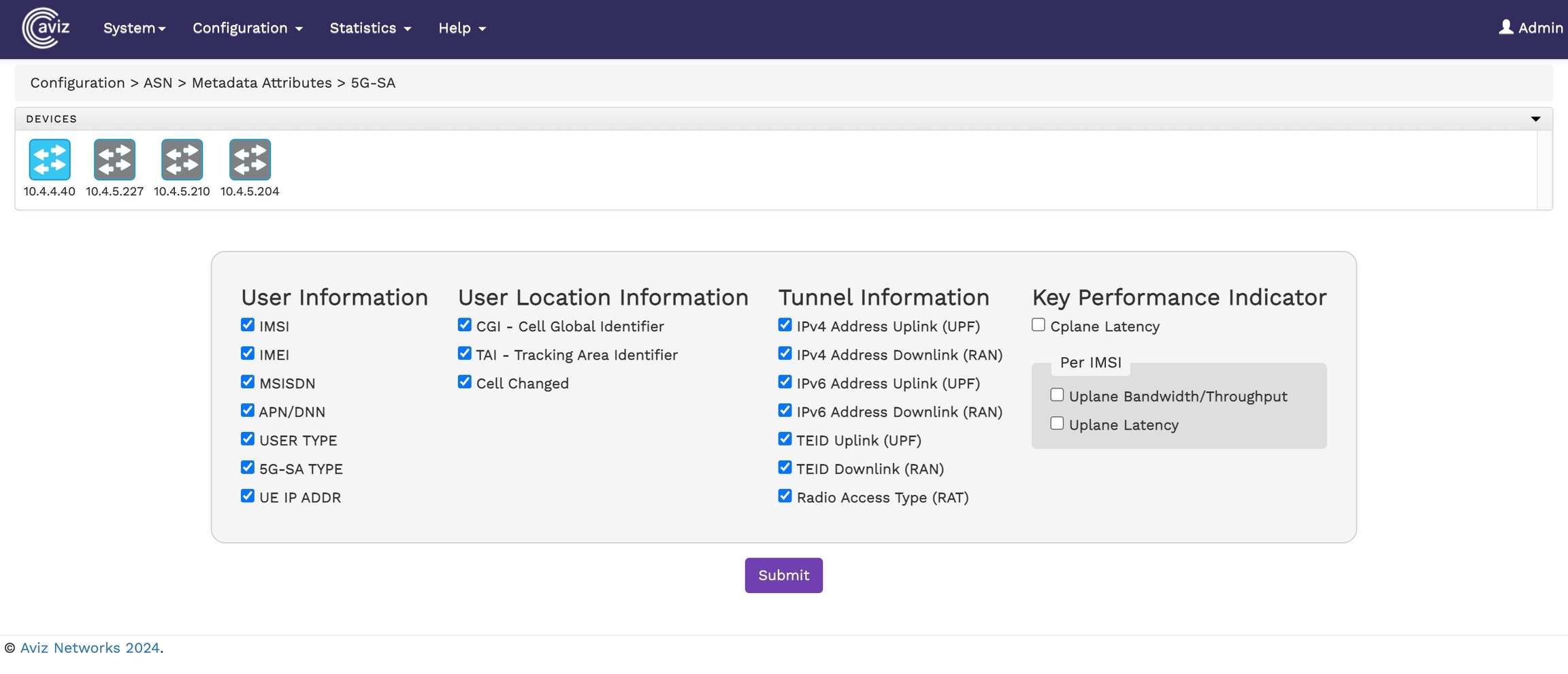 From this page, you can enable or disable the following metadata extraction options on the Aviz Service Node (ASN) for 5G-SA: