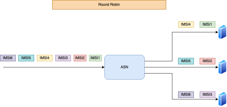 Alternatively, the ASN node can use round-robin load balancing, assigning flows to tools sequentially to evenly distribute the load, regardless of IMSI. A hash table maintains the tool ID for each subscriber, ensuring all packets from the same subscriber go to the same tool. This method effectively balances the network load, especially for large traffic flows.
