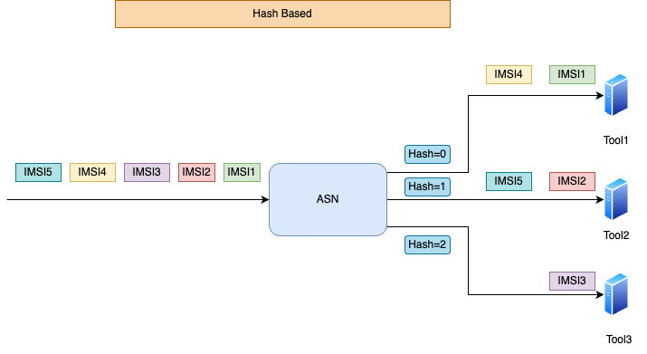 The IMSI is used to compute a hash value based on the number of probes in the core network. The hash function takes the modulo of the IMSI with the tool count, yielding a value between 0 and the tool count. This hash value is established when the first request packet of a subscriber flow is received. Using correlation logic, all subsequent control and user packets for the same subscriber are directed to the same tool, ensuring consistent and efficient traffic analysis.