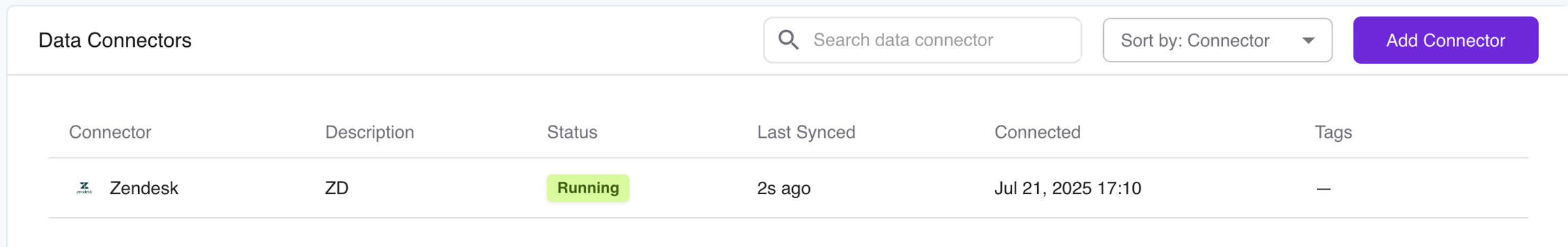 Once connected, Zendesk will appear in your data connectors list with sync status and timestamp