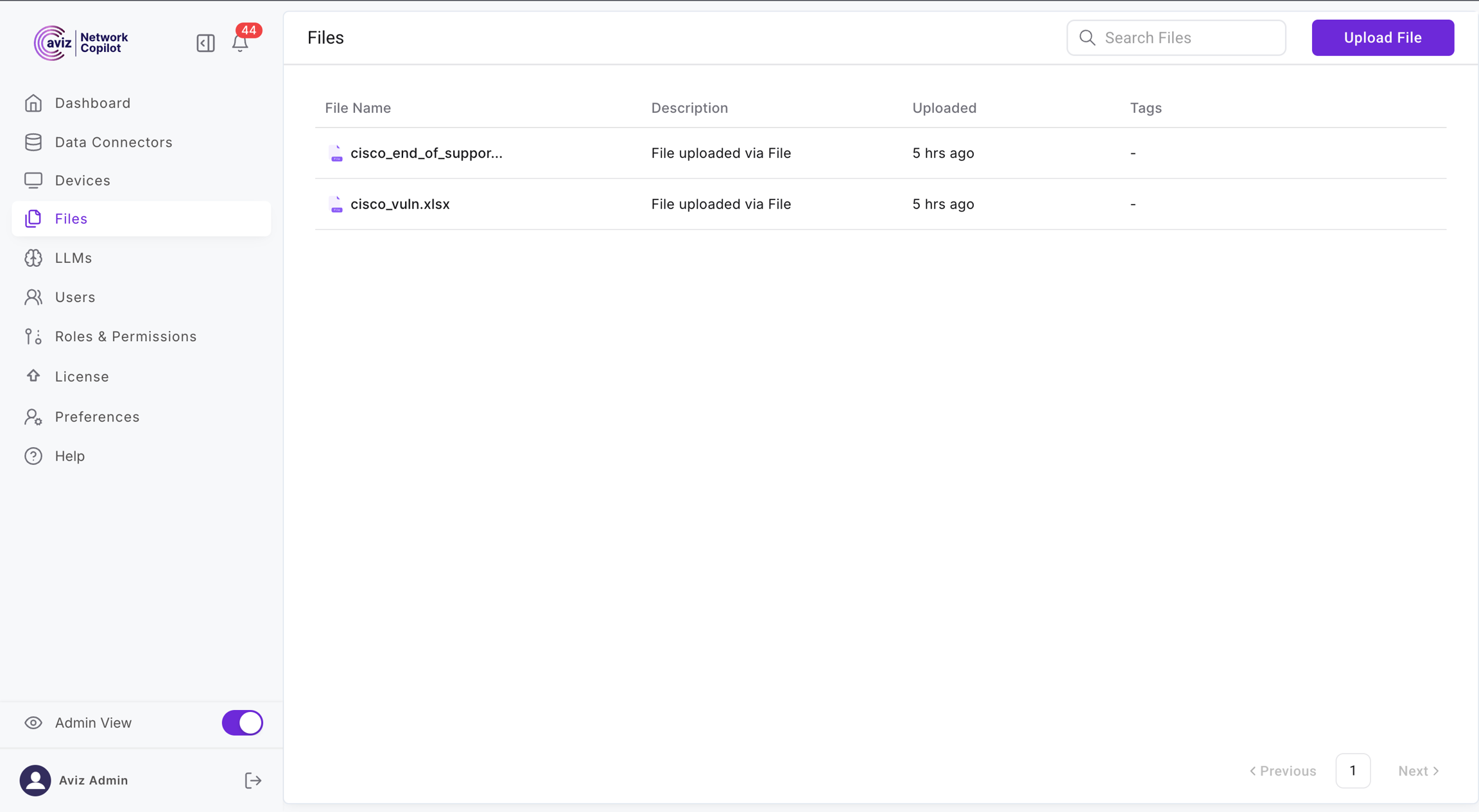 Admin View→FilesYou will see a table listing previously uploaded files (if any), including metadata like source, access level, and timestamp.