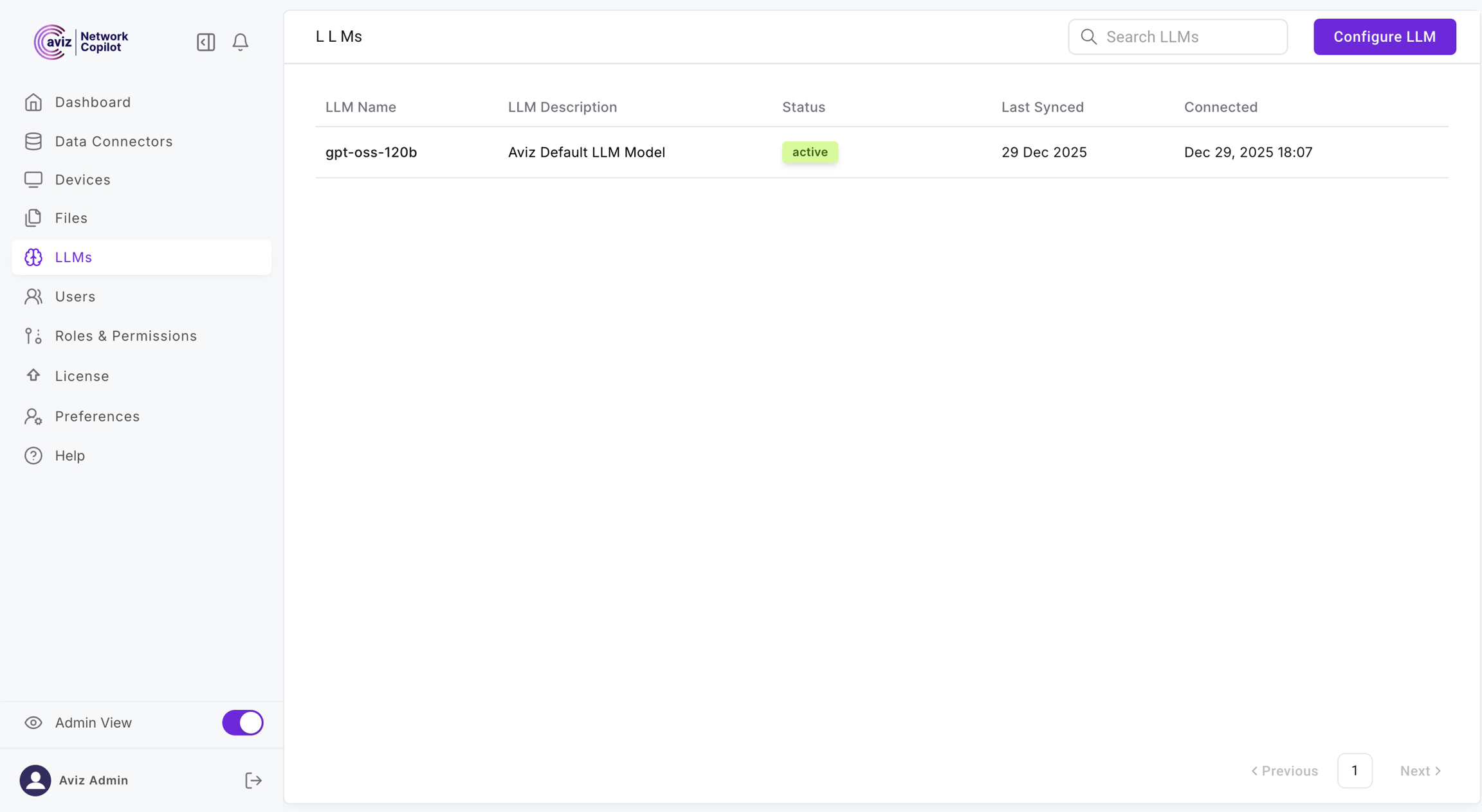 The LLM Management section allows administrators to configure, manage, and monitor Large Language Models used by Network Copilot for query processing and response generation.