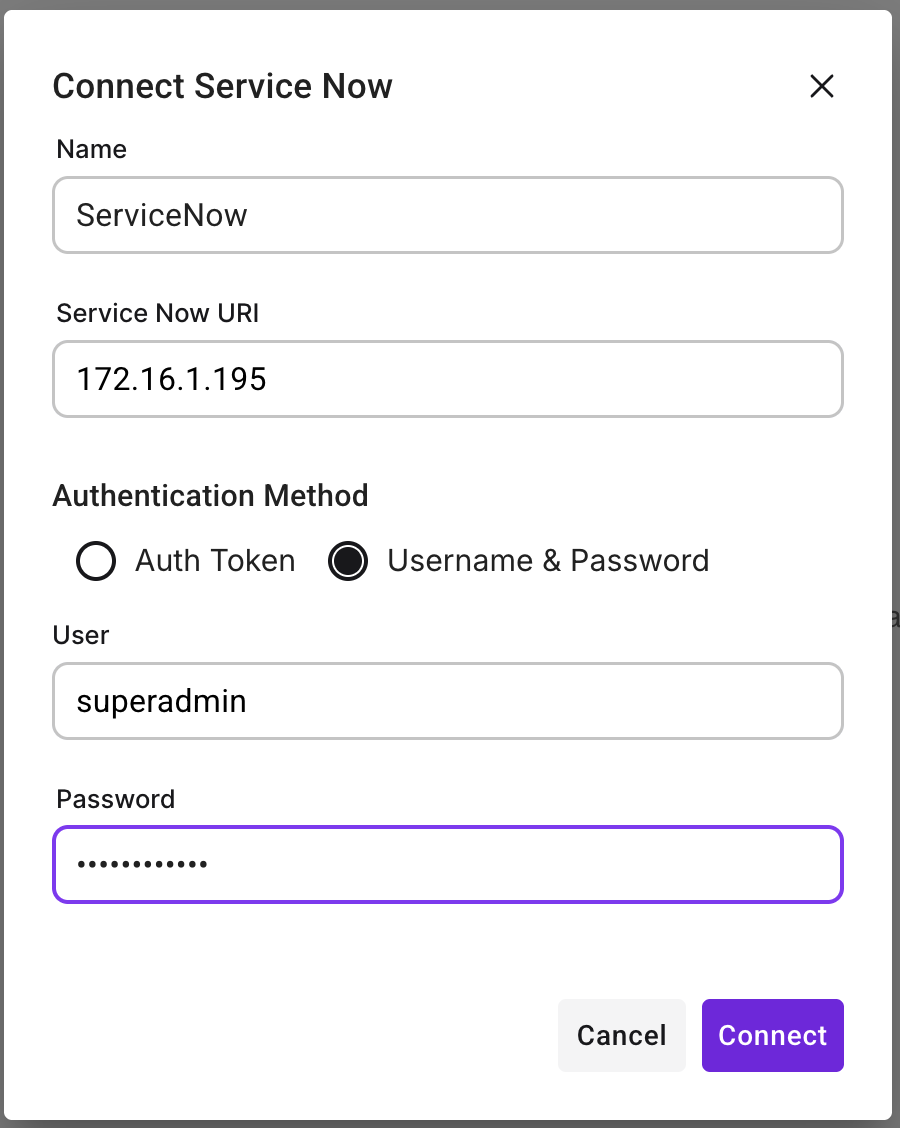 ServiceNow)ServiceNow URI – Your instance’s URI (e.g.,