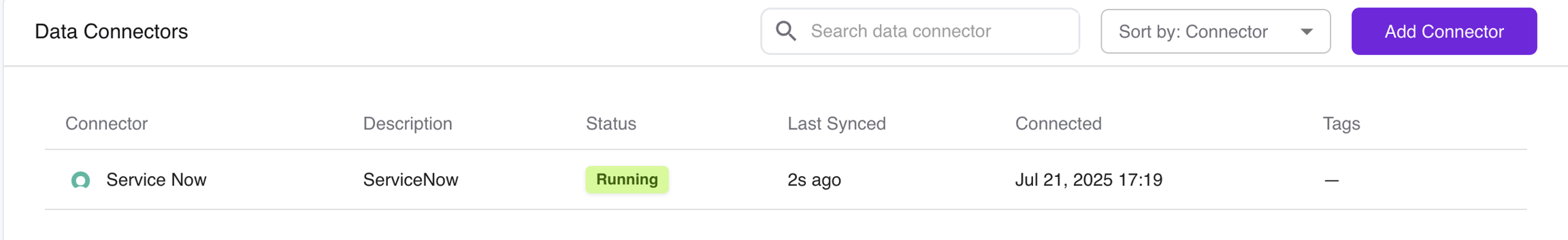 Once linked, ServiceNow will show up in your connectors list with sync status and last activity timestamp