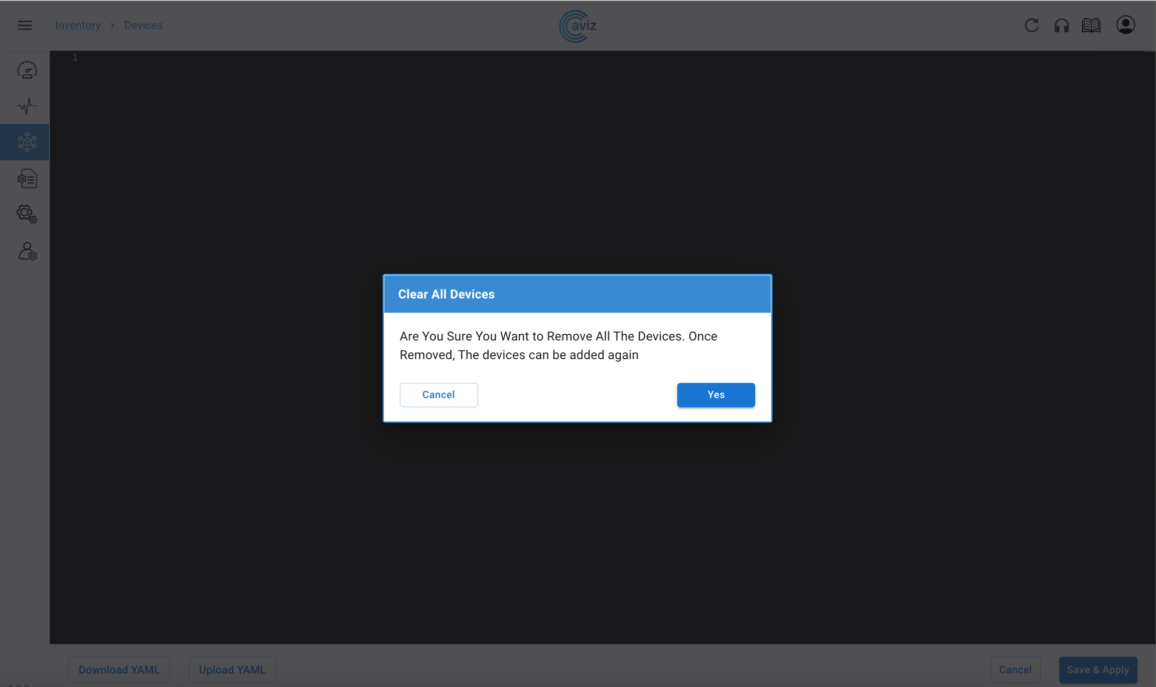 Add/Remove devices from the dashboard: You can onboard the devices using the YAML file upload or via in-built editor in the UI