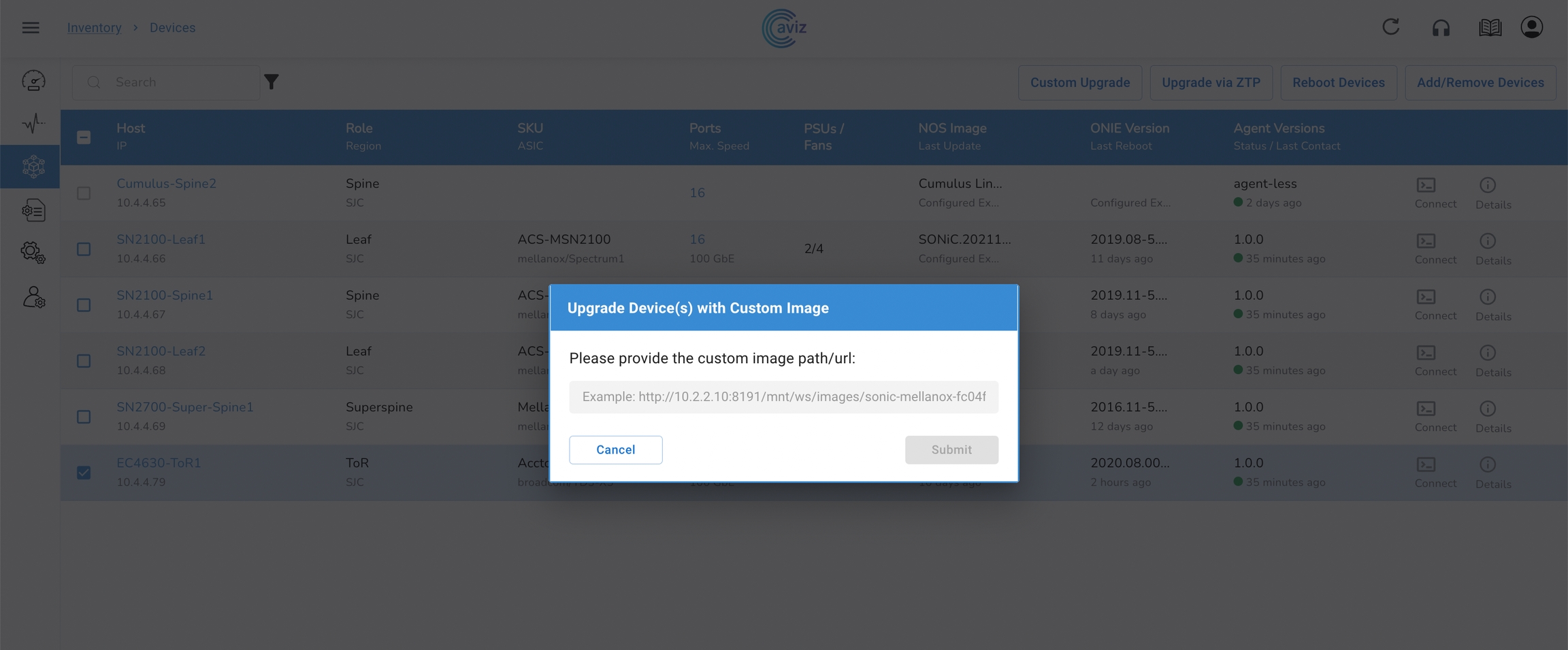 Custom OS upgrade: Upgrade the device OS with any customised image. You need to provide the correct path to ensure the OS is updated successfully