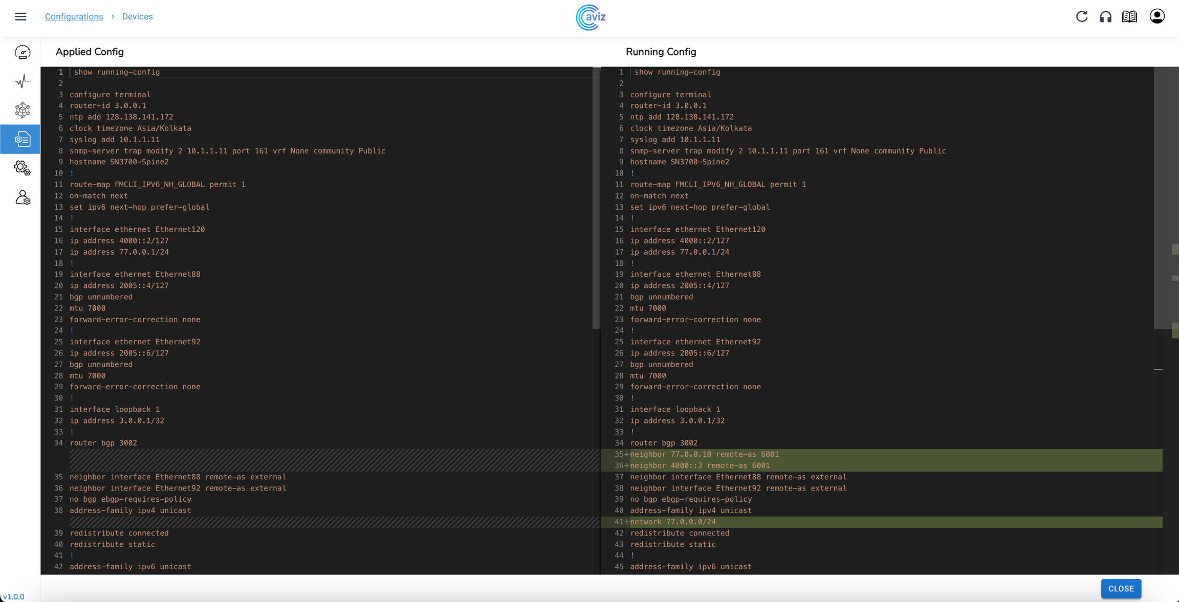 Compare the applied config vs running config on the selected device and highlight the diff changes, if any
