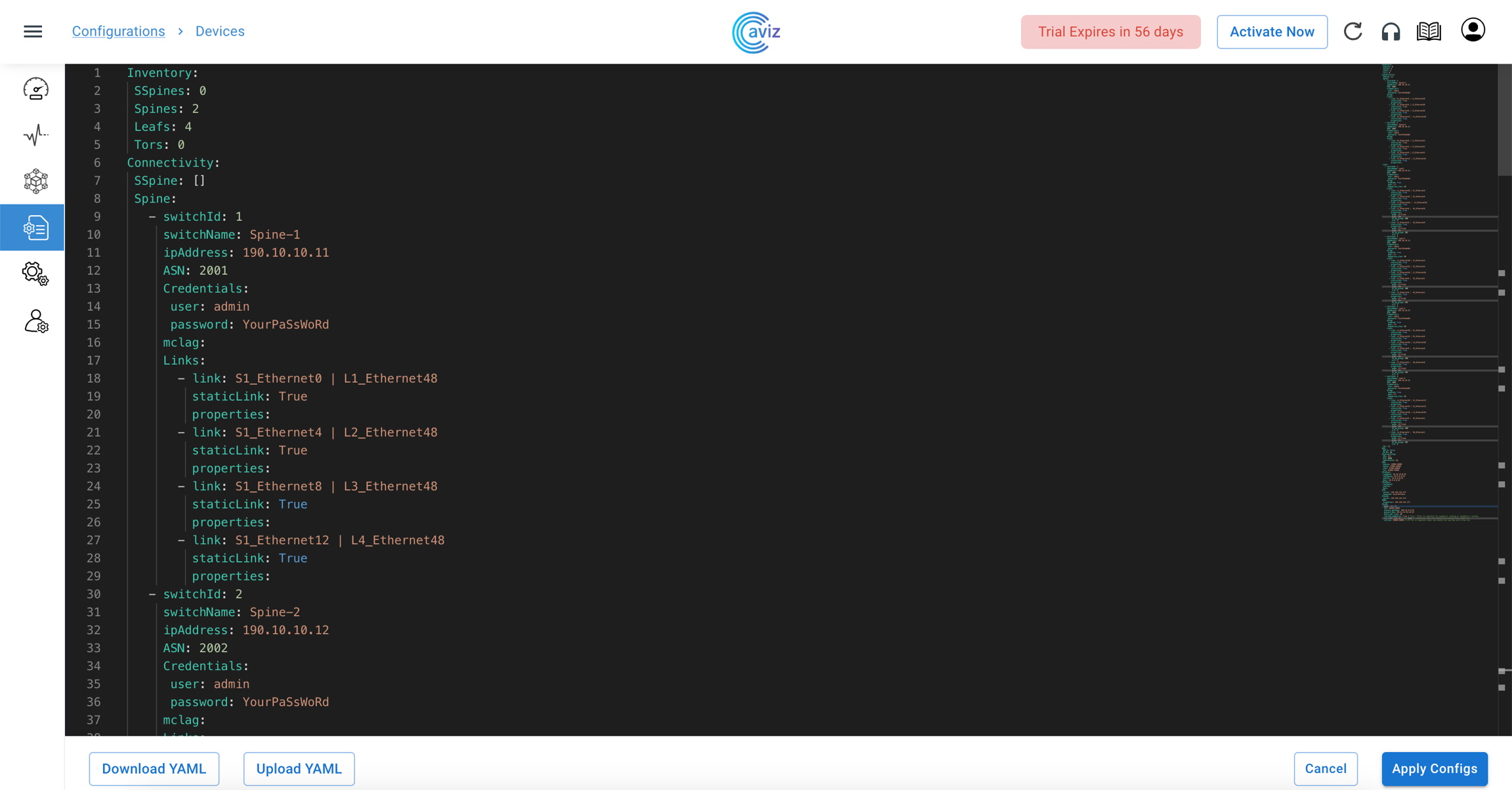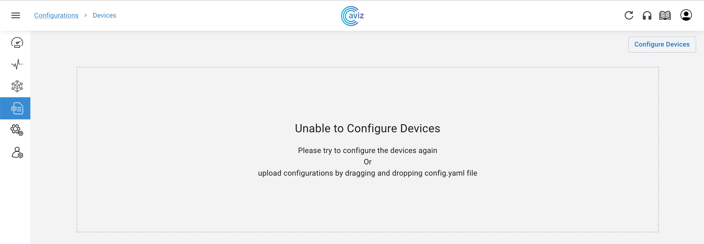 Click on the Configure Devices tab on the top right corner. This opens a new screen with sample device configuration. You can edit the configurations directly in the UI to make the desired changes. You can also download the sample YAML file by clicking on Download YAML tab, provided at the bottom of the above screen, make new changes and upload the YAML file using Upload YAML tab.