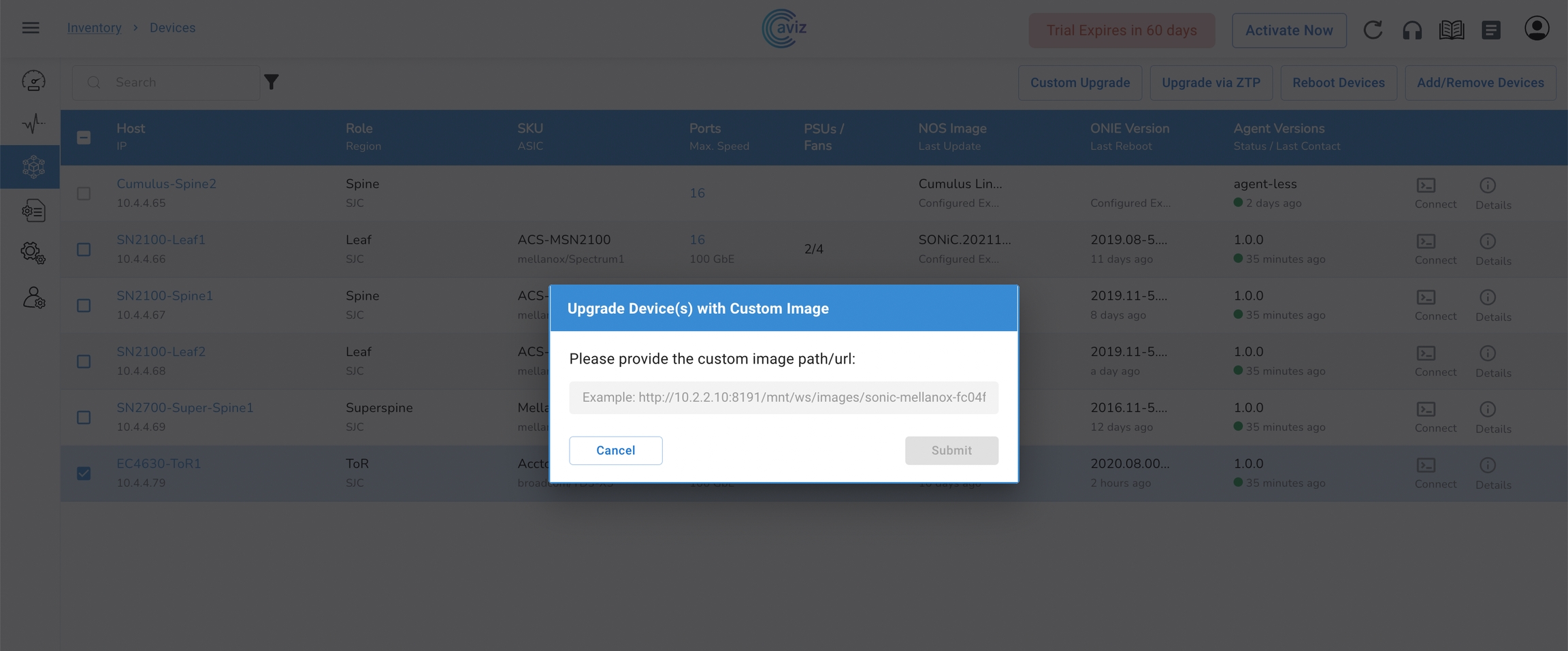 Custom OS upgrade: Upgrade the device OS with any customised image. You need to provide the correct path to ensure the OS is updated successfully