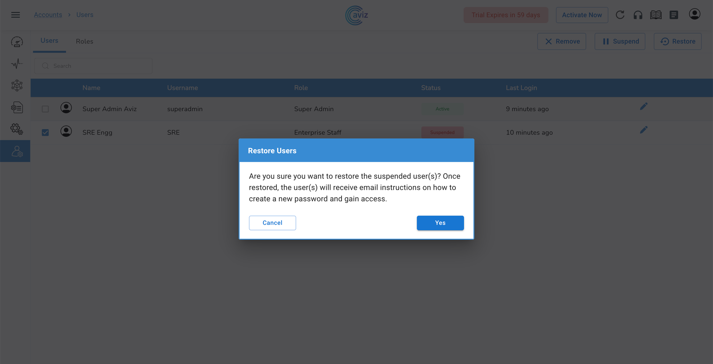 Navigate to Accounts >> Users >> ((Select Users you want to restore)) >> Restore >> Yes