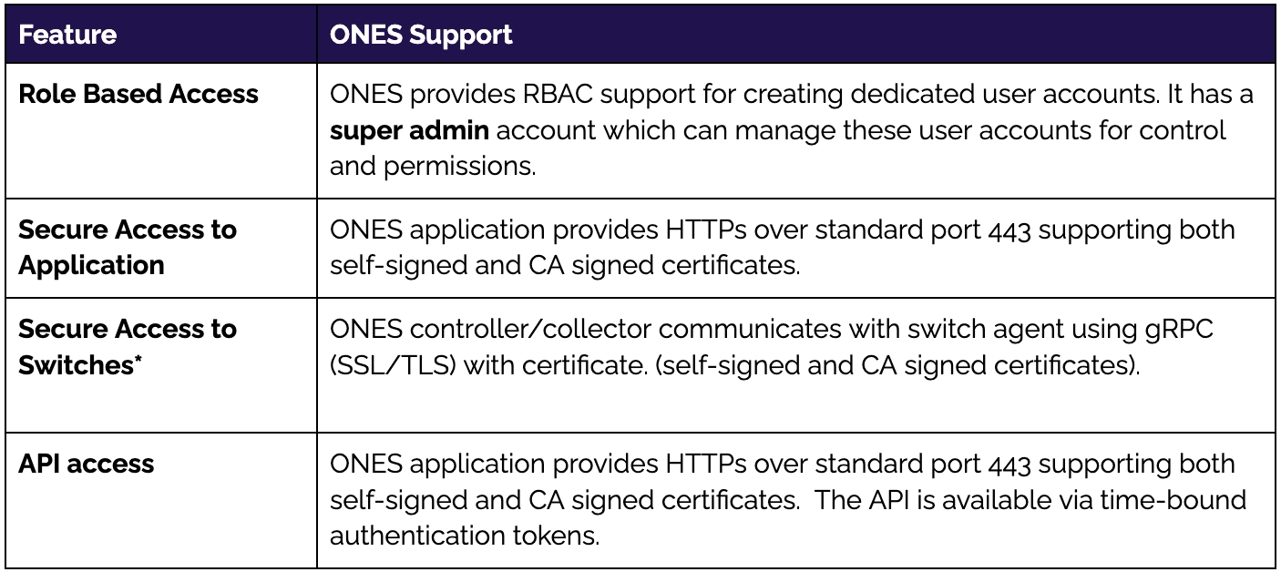 ONES utilizes gRPC infrastructure to communicate with switch agents. TLS (Transport Layer Security) is the primary security protocol used by gRPC to secure communication between the client and the server. TLS provides authentication, confidentiality, and integrity of data. Authentication is achieved using digital certificates, which verify the identity of the client and the server.