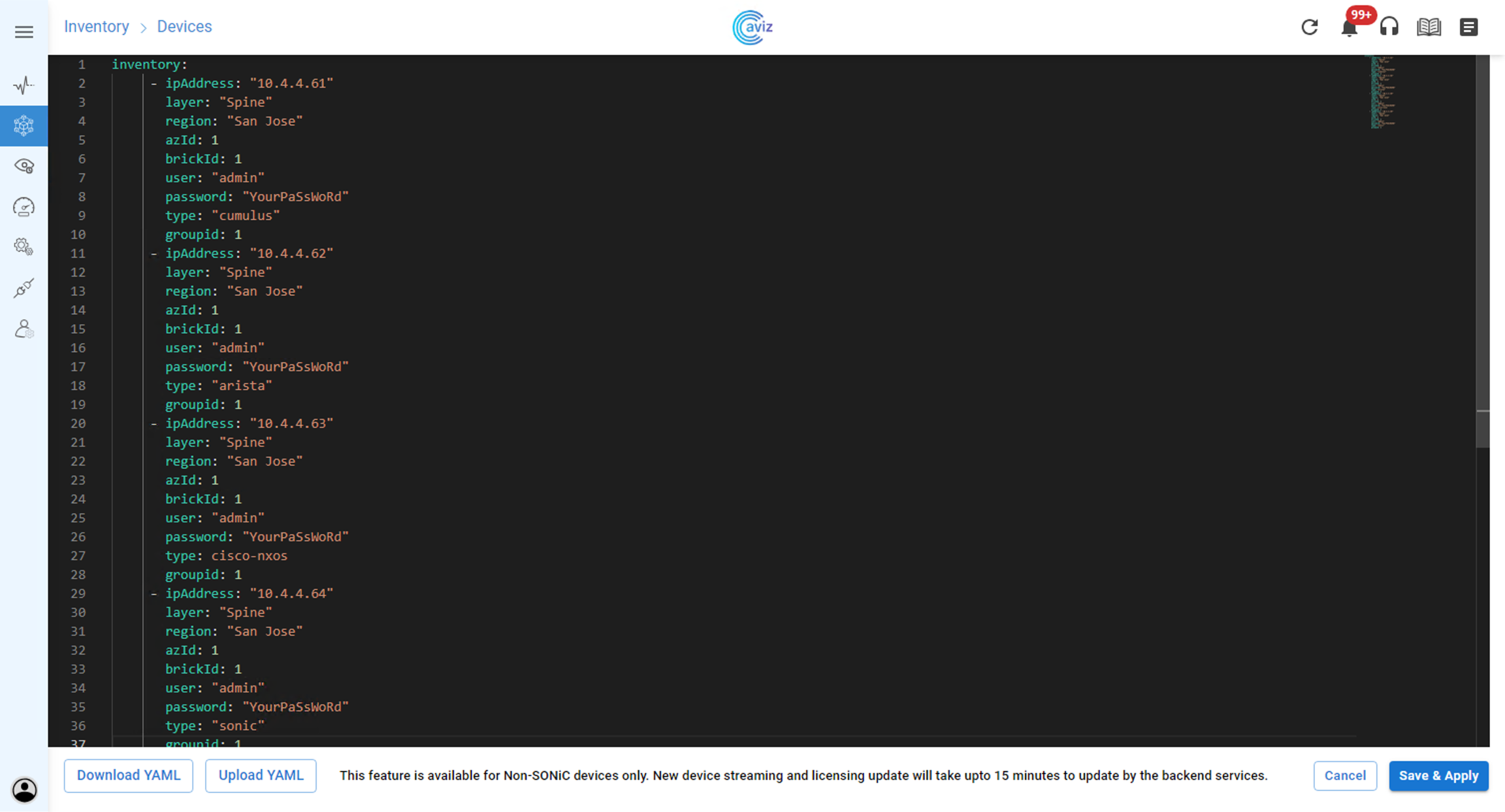 Navigate to Inventory >> Devices >> Add Devices >> Use YAML