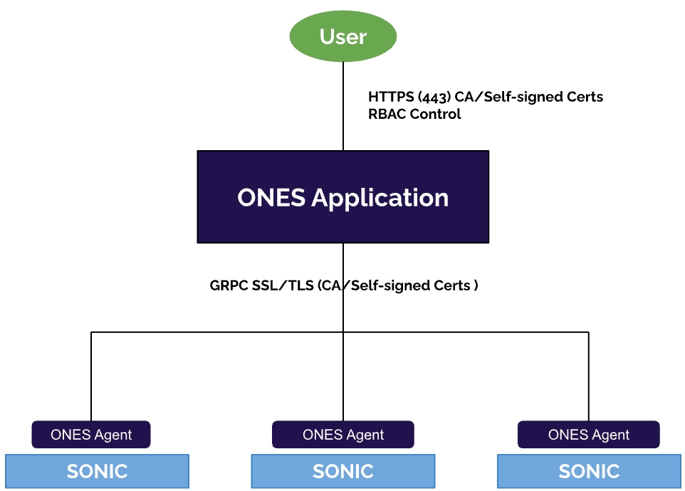 ONES utilizes gRPC infrastructure to communicate with switch agents. TLS (Transport Layer Security) is the primary security protocol used by gRPC to secure communication between the client and the server. TLS provides authentication, confidentiality, and integrity of data. Authentication is achieved using digital certificates, which verify the identity of the client and the server.