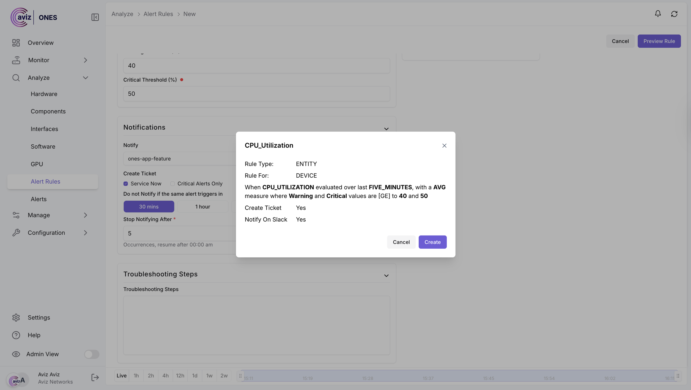 Once the device CPU Utilization goes above the threshold value it will start pushing notifications to SLACK & ServiceNow/Zendesk Support tickets & also inside the ONES Alert Page