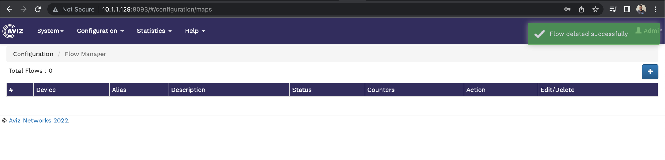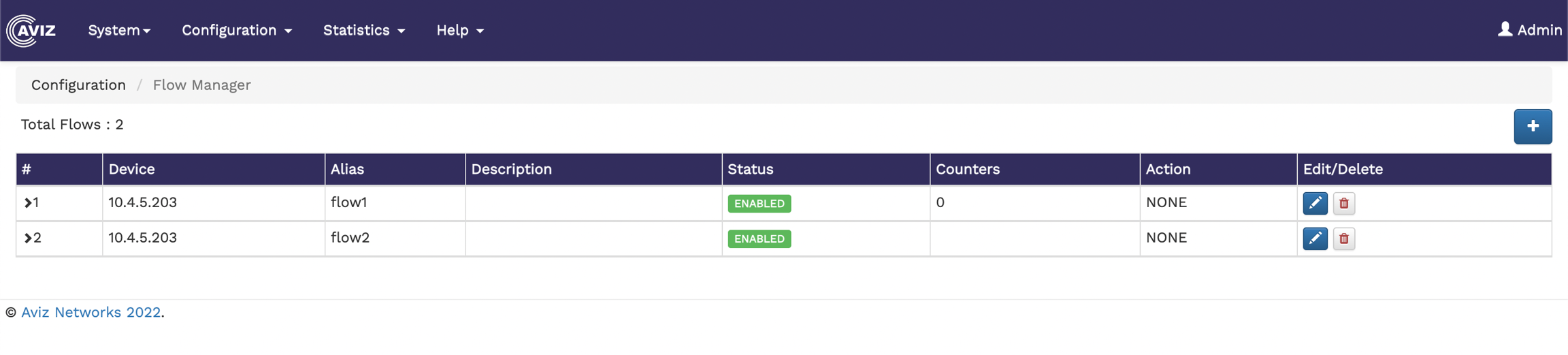 The Flow Manager page shows the number of existing flows and a table showing the flow details, such as, device ID, alias, description of the flow, status, the available counters, the action performed, and an option to edit and delete flows.