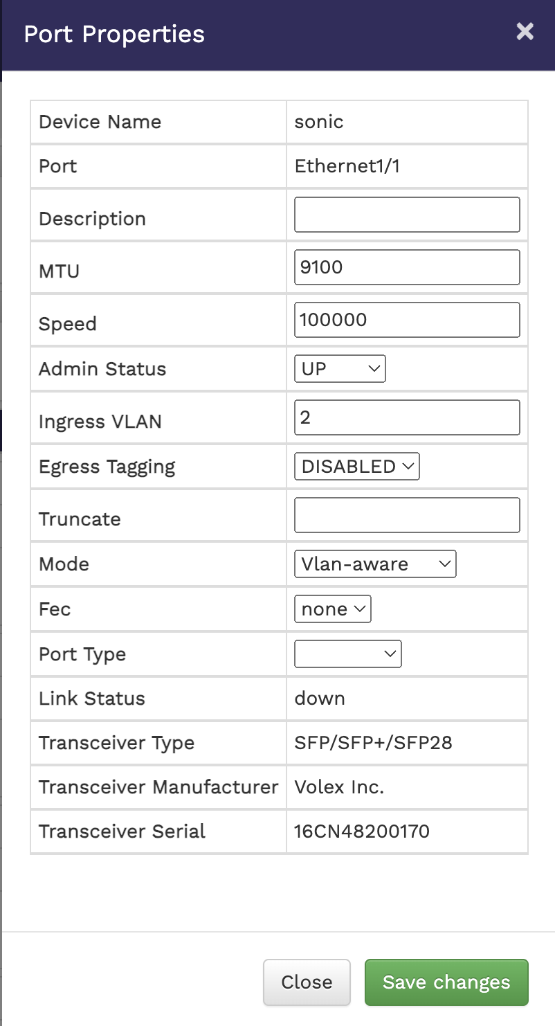 Update the properties as required. The properties you can update are - Description, MTU, Speed, Admin Status, Ingress VLAN, Egress Tagging, Truncate, Mode, Fec and Port Type. You can also see other non-changeable fields with more information about the selected port.