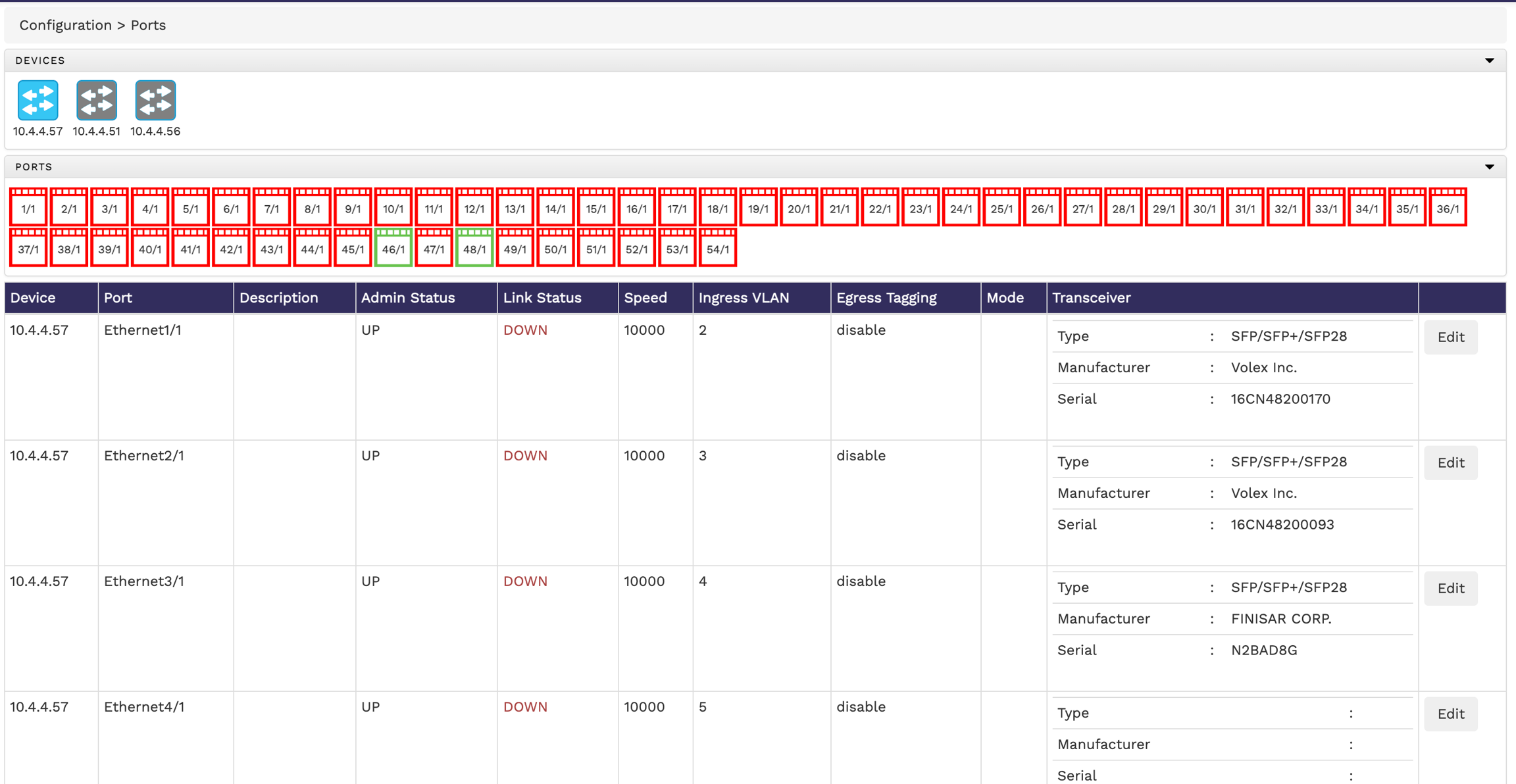 The Ports page shows the connected devices, the ports of each of those connected devices, and a table displaying the details of the ports, such as, the admin status, link status, speed, ingress VLAN, egress tagging, truncation, mode, and the tranceiver details. Note that, the ports that have their link status as 'UP' are shown in green, whereas the ones with the link ststus as 'DOWN' are shown in red. You can hover the mouse pointer over the devices icon or ports icon for more information on that device or port.