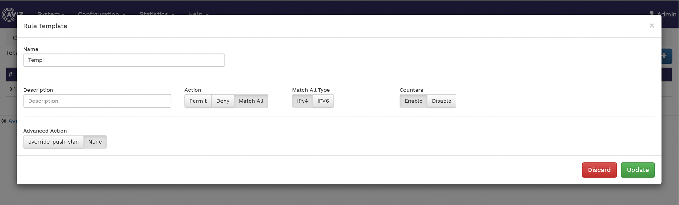 Action - select an action for the template. The available options are Permit, Deny, Match All.