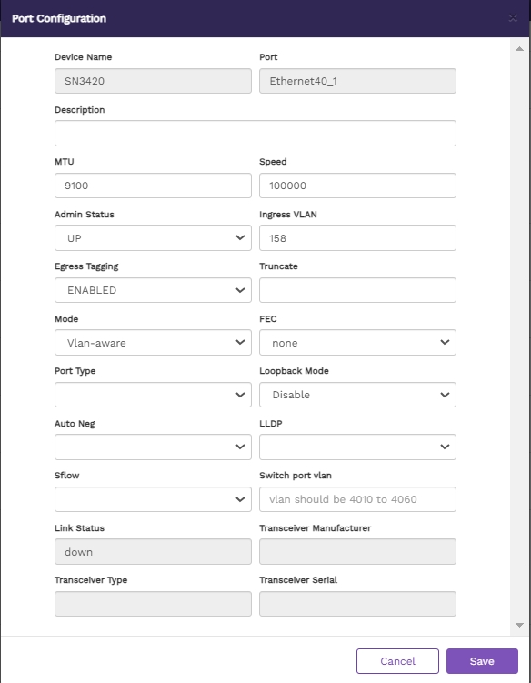 Update the properties as required. The properties you can update are - Description, MTU, Speed, Admin Status, Ingress VLAN, Egress Tagging, Truncate, Mode, Fec , Port Type, Loopback Mode, Auto Neg, LLDP, sFlow and Switch Port Vlan. You can also see other non-changeable fields with more information about the selected port.