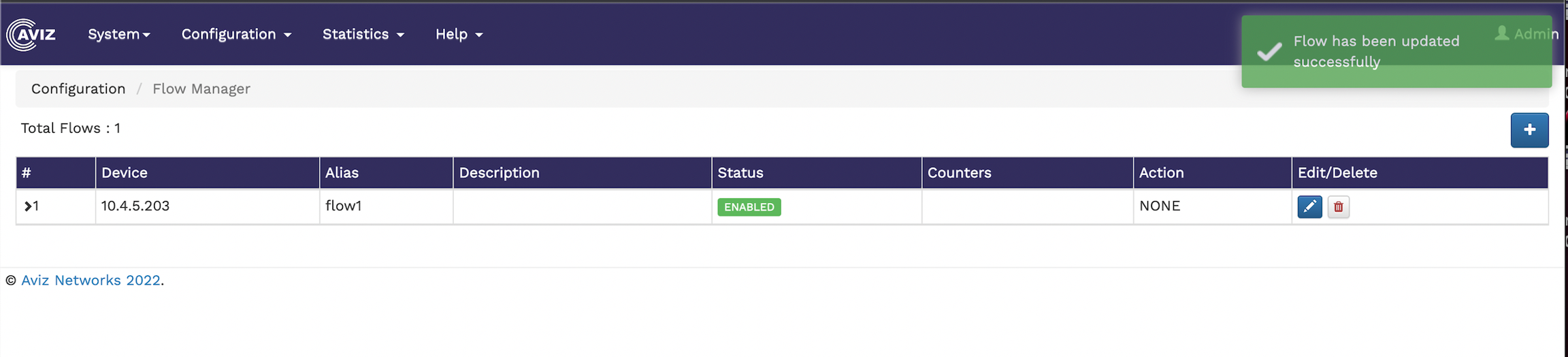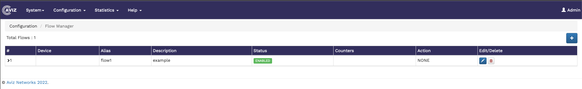 The Flow Manager page shows the number of existing flows and a table showing the flow details, such as device ID, alias, description of the flow, status, the available counters, the action performed, and an option to edit and delete flows.