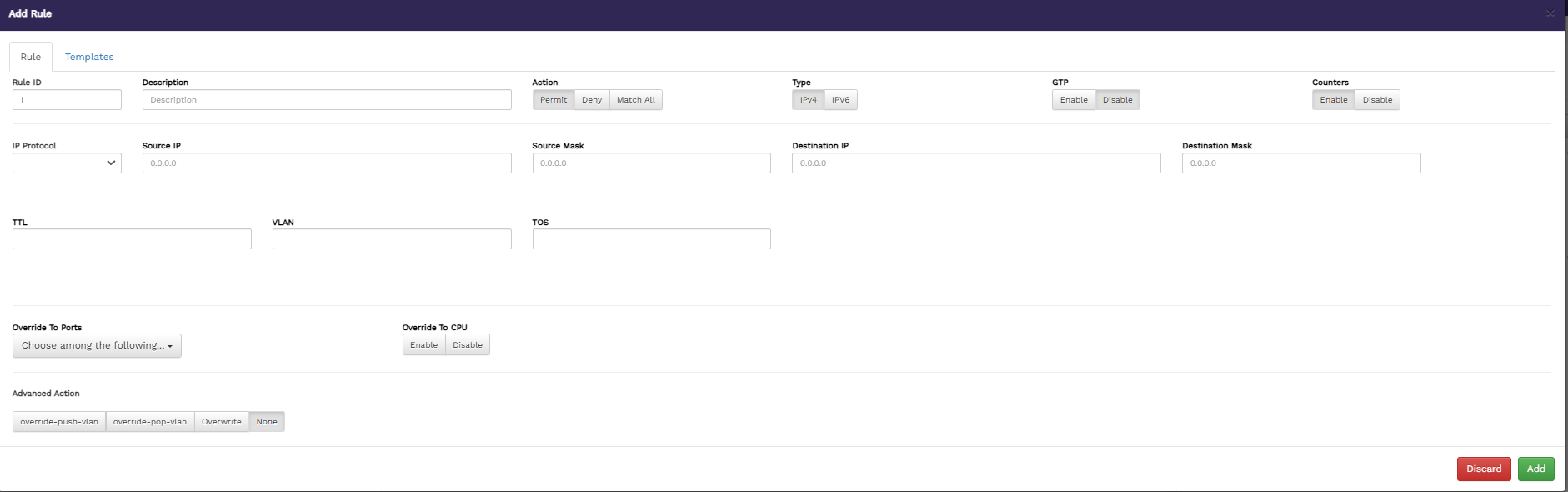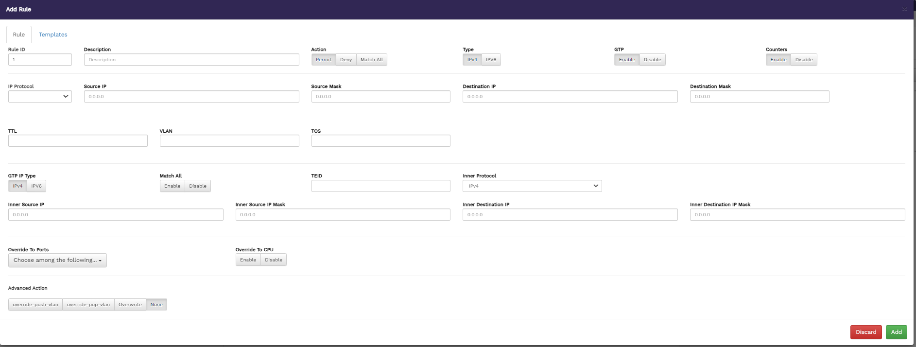 Advanced Action - specify the override actions. The available options are override-push-vlan, override-pop-vlan, and Overwrite. If you select override-push-vlan, you must also provide the VLAN ID, in the VLAN ID field. And if you select Overwrite ,then you must provide Destination IP or Destination mac or Destination Port.