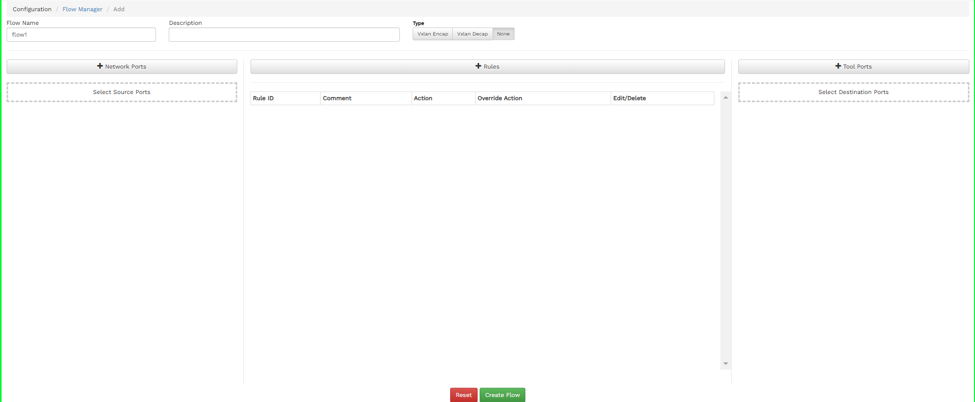 To create and configure flows from the FlowVision GUI, click Configuration > Flow Manager.