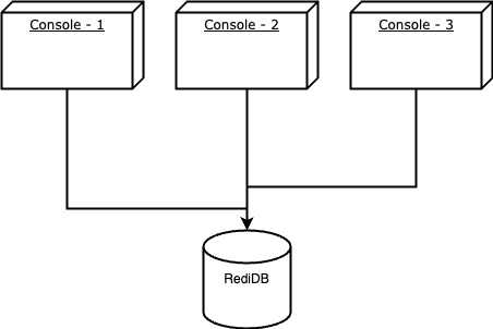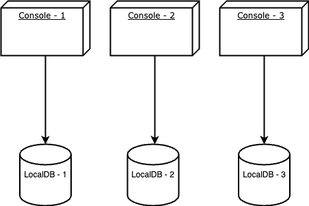 In the picture below, three distinct ISCLI processes are engaged with three separate local databases. As a result, configurations made within one process remain isolated and are not accessible or visible to the other concurrent processes.
